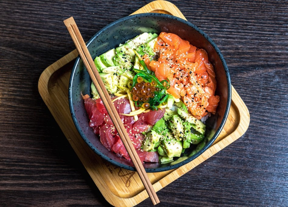 Thunfisch, Lachs, Avocado, Kaviar, Mango, Wakame mit Reis