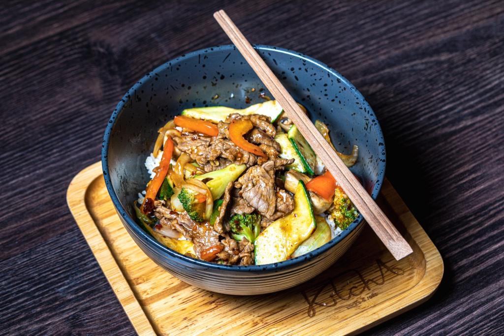 im Wok gebraten in hausgemachter Szechuan-Sauce mit Reis