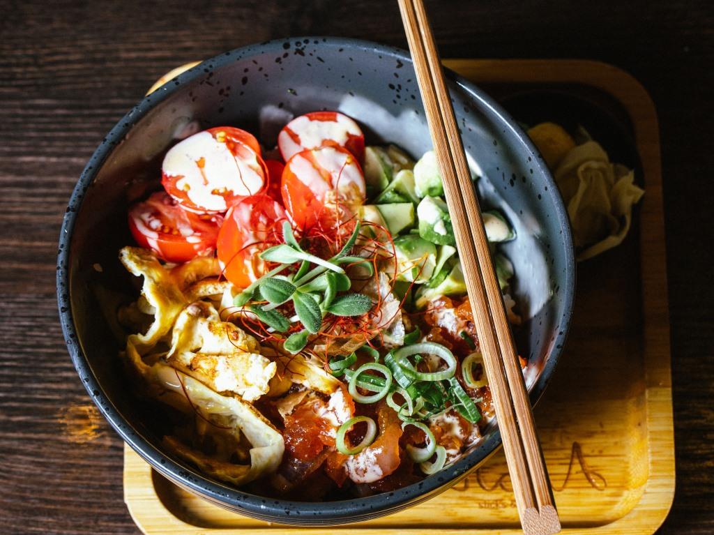 spicy Tuna,  Avocado, Eier, Cocktailtomaten, Sprossen, Röstzwiebeln mit Reis