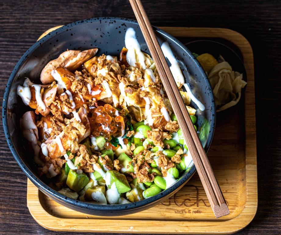 sautierter Lachs, Edamame, Eie, Avocado, Spinat, Kaviar, Röstzwiebeln mit Reis