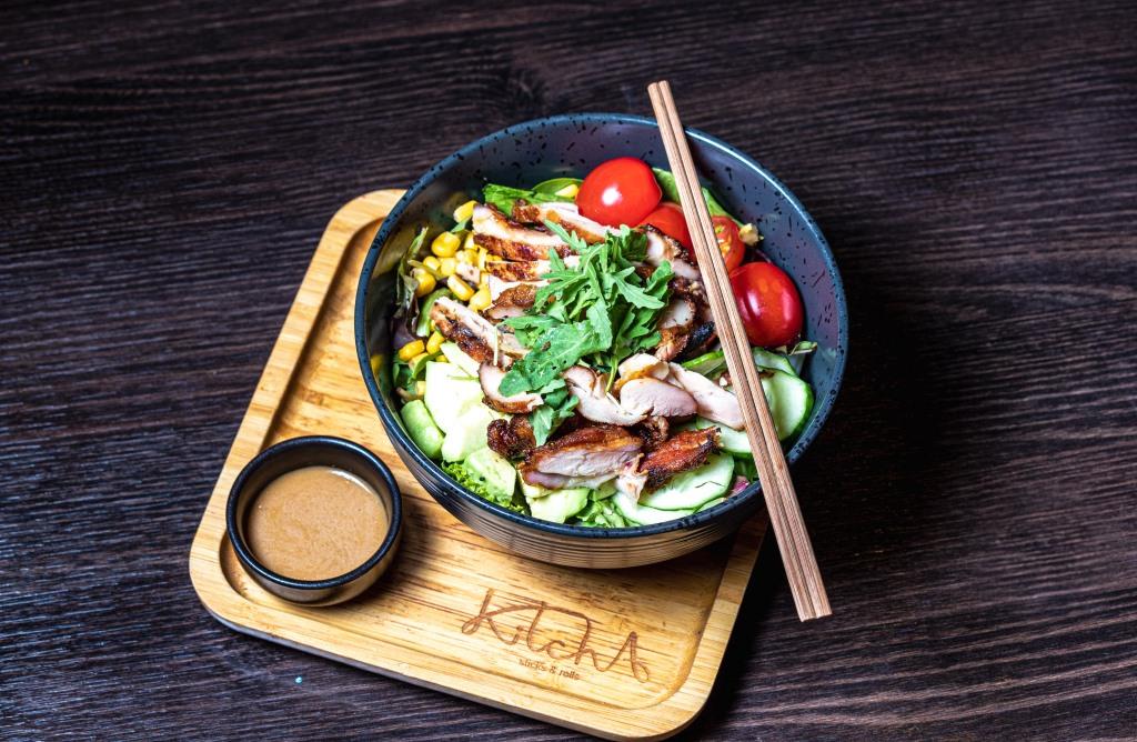 mariniertes Hühnchen vom Robatagrill auf Asia Mix Salatblättern