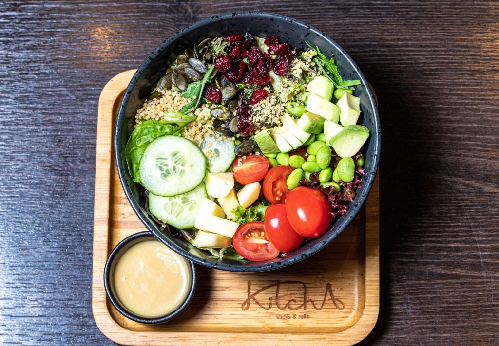 Asia Mix Salatblätter, Edamamebohnen, Cranberries, Kürbiskerne, Quinoa, Gurken, Cocktailtomaten, Avocado, Apfel